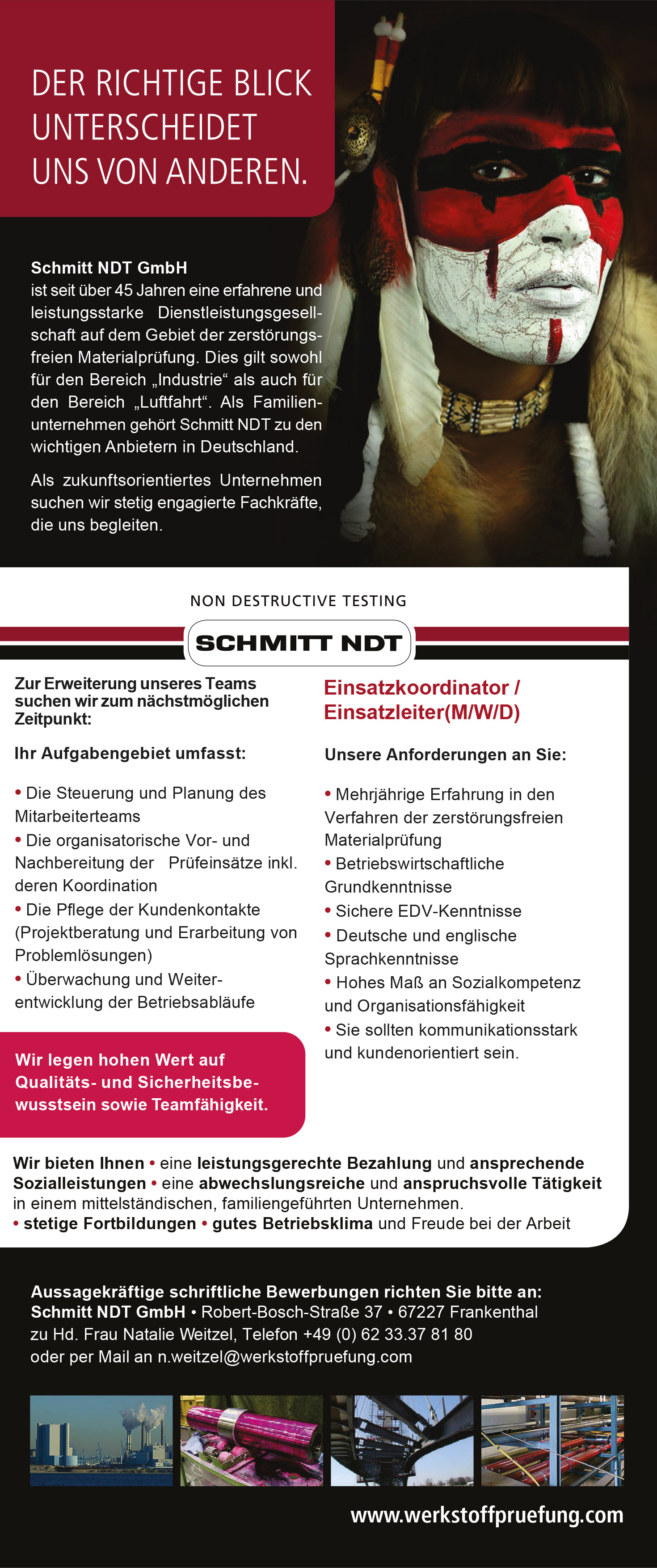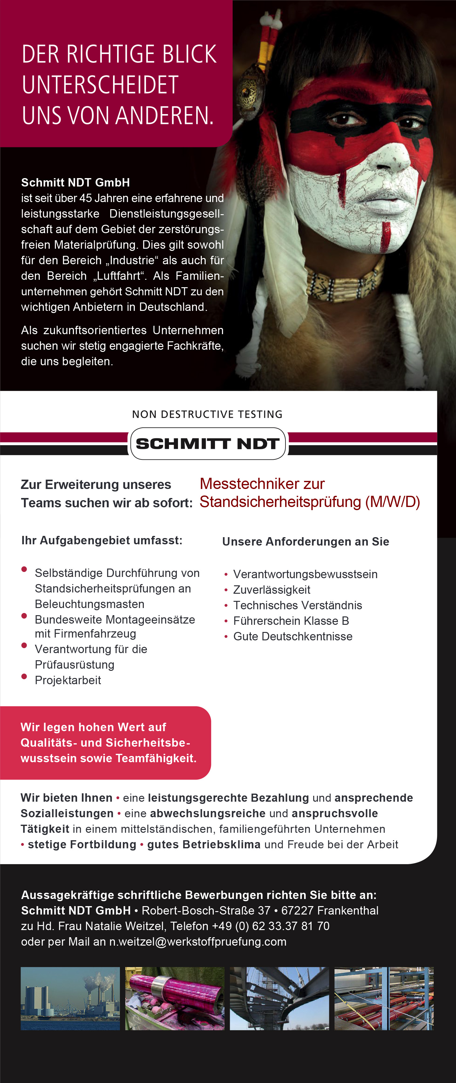 Are you looking for exciting activities in a varied medium-sized company in which you can contribute your outstanding technical qualifications in an environment operating according to state-of-the-art processes?Schmitt NDT GmbH operates in diverse sectors on the customer side and according to the highest-quality processes as well as the most current accreditations. In the process, we accompany your career path actively – the development of your knowledge is our top priority.