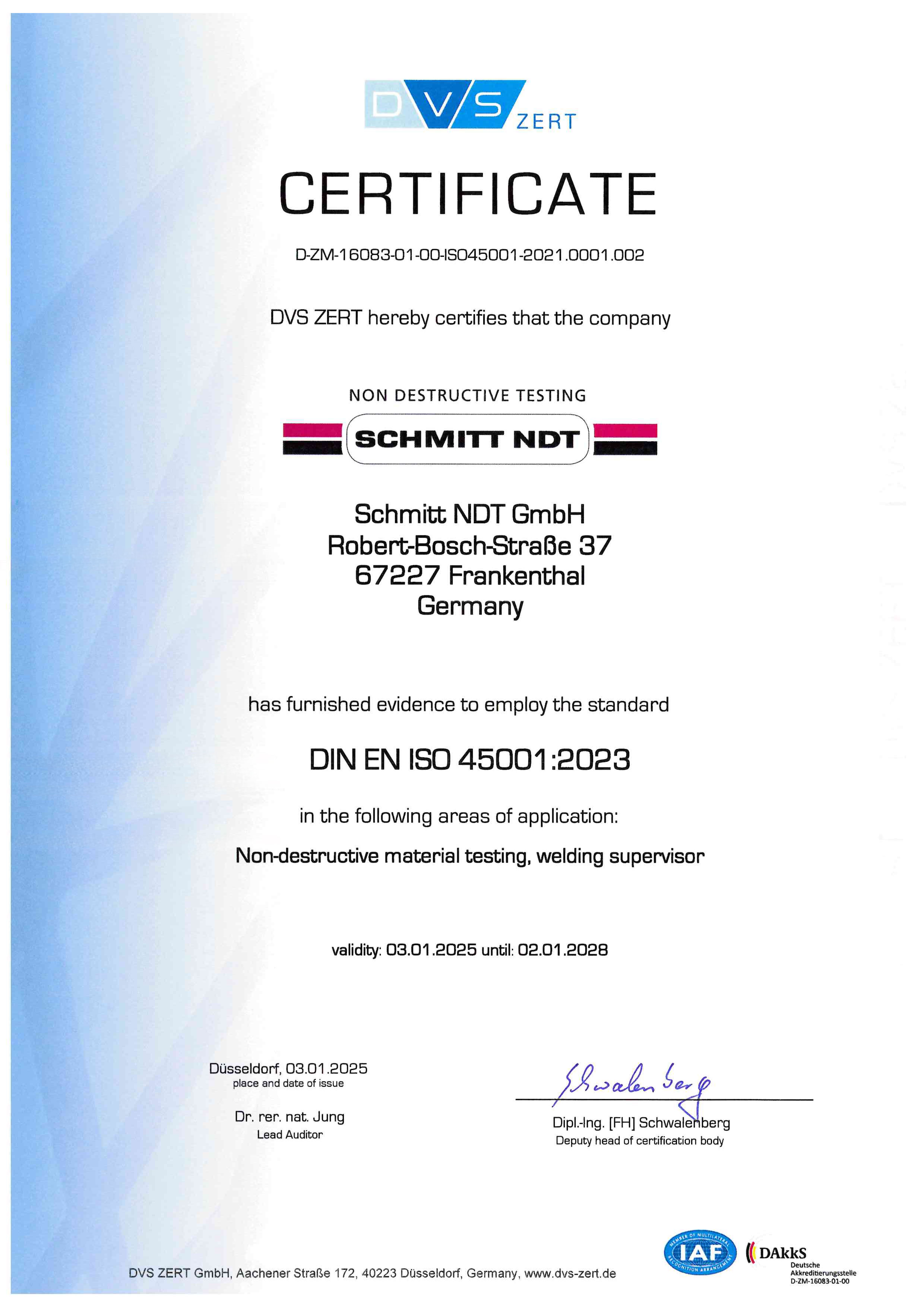 Schmitt NDT GmbH is always currently accredited and certified. This is a par-for-the-course process at the company and necessary in order to test according to the latest expertise. The advance training of the employees is just as important at Schmitt NDT GmbH as experience and the development of techniques